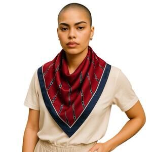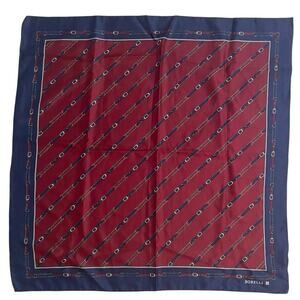 Crafted by Borelli, this polyester scarf features a sophisticated equestrian-inspired design with chain and belt motifs. The rich burgundy and navy blue tones complement formal and business attire, making it a versatile accessory for professional settings. The luxurious scarf adds a touch of elegance.
