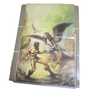 Printed by Verkerke in the Netherlands and measuring approximately 36.25 x 23 inches, the artwork showcases Vallejo’s signature muscle-bound hero clashing with a fierce harpy-like winged woman, set against a dramatic mystical backdrop.
