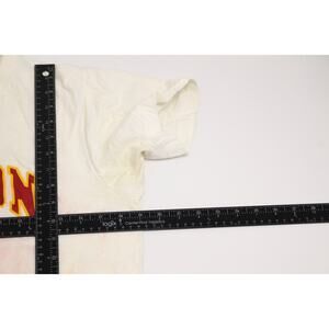 Condition: some wear, cracking on graphic, yellowing on pits and throughout, light red stains front and back