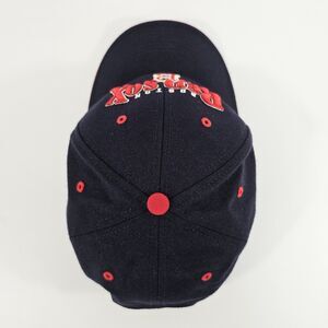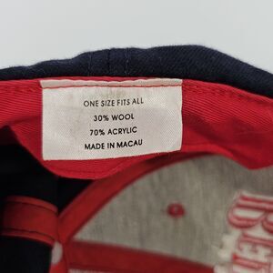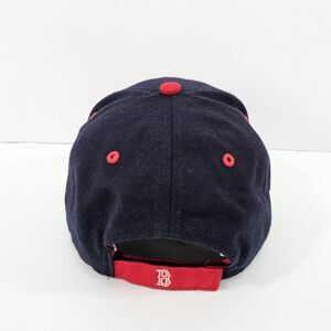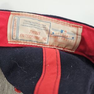 Classic Boston Red Sox baseball cap manufactured by Twins Enterprise, featuring bold, embroidered team graphics on the front panel and signature "B" logo details at the rear. Structured navy crown with contrasting red accents, eyelets, and button, finished with a red curved brim and adjustable strapback for a custom fit. Interior labels indicate "One Size Fits All," composed of 30% wool and 70% acrylic and made in Macau. The item displays quality stitching and authentic 90s styling, suitable for collectors or fans looking for vintage Major League Baseball memorabilia. Condition is excellent, showing only minimal signs of pre-owned wear with no noticeable stains or damage. Ideal addition for sportswear collections, streetwear outfits, or gifting to Red Sox enthusiasts.