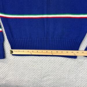 Great looking vintage Boston Traders Mens Knit Sweater Striped Crew Neck Tight Knit size Med Navy green white red.