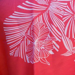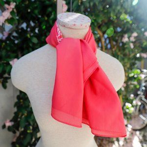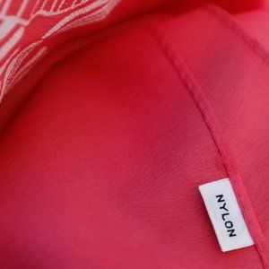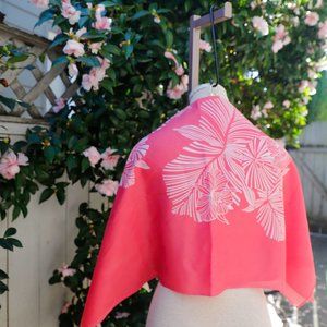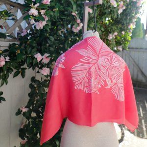 This is such a fun piece! Vibrant pink nylon with a beautiful palm frond and floral pattern in white. It's a large pattern on one end of the scarf which utilizes the negative space and shows off the color even more. Its lovely folded and tied around the neck, around the shoulders, I'm sure would look great as a swim cover up in the summer or on vacation, and it's a good size so it could be used as a table scarf (which is what I bought it for), it would make potted plants pop! Perfect for Barbiecore trend, perfect for plant parents. 36 by 36 inches square.