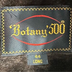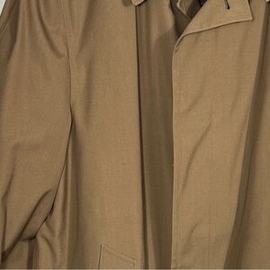 Vintage Botany 500 trench coat, size 44 long. Zip-out faux fur lining, button close in a hidden placket. Side slash pockets, large back slit with a few loose stitches at the top of the slit (see photo). Dark tan color.