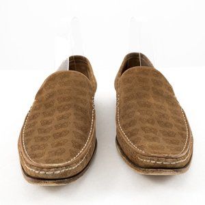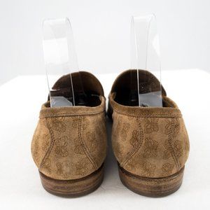 Rare vintage Bottega Veneta Italian suede leather loafers printed w brand's butterfly logo. Easy slip on, pointed toe, low wooden heel, contrast cream stitching. Chic & versatile for everyday. Handmade in Italy. V comfortable. EUC. Fab gift!