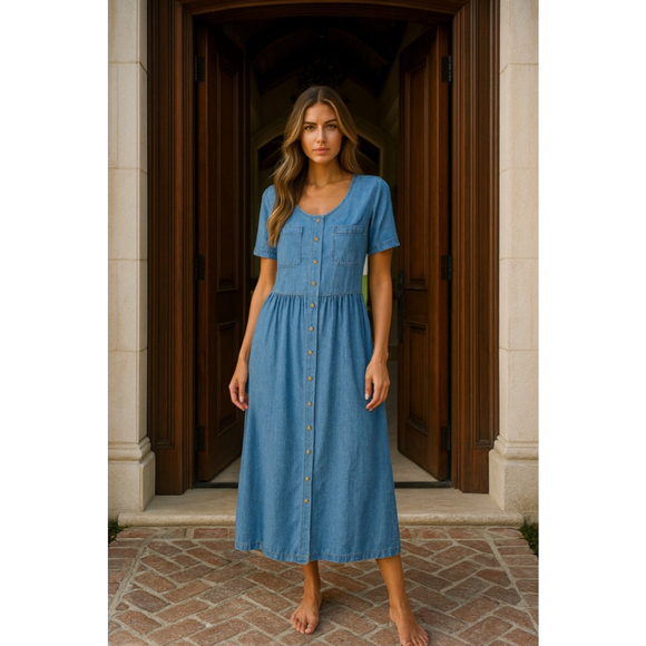 This vintage 90s Boundary Waters denim midi dress offers timeless casual style with a soft, 100% cotton medium-wash denim construction. Featuring a scoop neckline, full front button closure, two chest pockets, short sleeves, and hidden side pockets, it’s perfect for effortless everyday wear. The gathered waistline adds a relaxed feminine silhouette, making it ideal for layering in all seasons.
