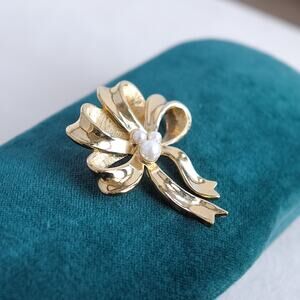 Elegant vintage bow ribbon brooch with polished gold tone finish and faux pearl accents!