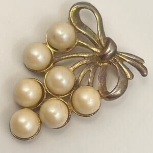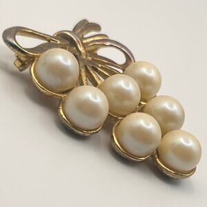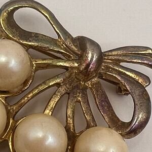 Vintage Bow and Grape Cluster Brooch Pin Faux Pearls Gold Wash 60s 70s