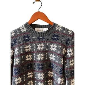 Vintage Bowen & Wright Boys Wool Snowflake Print Sweater Gray, size L. Good preowned condition, 100% wool with ribbed crewneck.