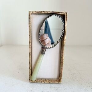 Vintage Boxed Asian Geisha Hand Painted Porcelain Small Hand Jade Handle Mirror