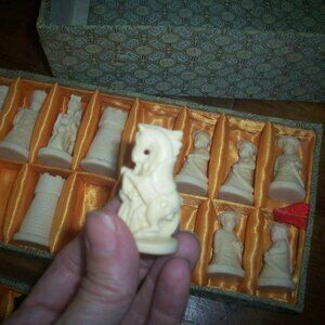 Vintage Boxed Chinese Carved Chess Set Fabric Lined 2 Tier Box w/ Matching Board