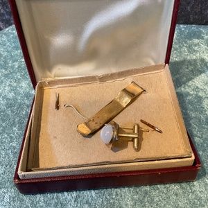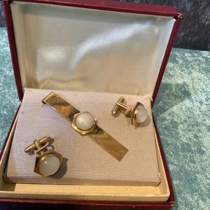 Vintage Boxed Set Gold and White French Cuff Links and Tie Tack