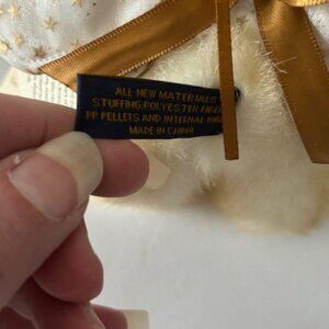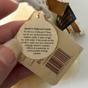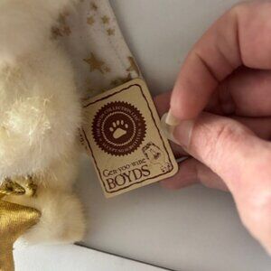 The Vintage Boyds Bear collectible from the TJ's Best Dressed Collection is the Ambrosia Angel Wish which is NWT and is a charming addition to any teddy bear enthusiast's collection. This plush bear, featuring black eyes and a white bear color with angel wings holding a star stands at 6 inches tall. Made from beans, plush, and fake fur, this original vintage piece is sure to be a treasured item for any collector of Boyds Bears.