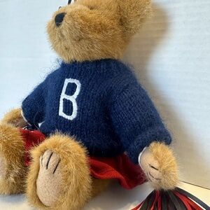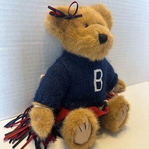 This bear’s name is Tami P Rally and she stands at 11 inches tall. She is a tan bear dressed in a sporty cheerleaders outfit with a navy blue sweater and matching red and white skirt. Along with her cute outfit she comes with a matching pom poms and a bow on her head. She is fully jointed and posable. She is a must have for any collector. Boyds Bears are no longer being produced.