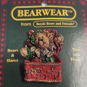 Charming Bearwear bear pin with intricate details. Features a bear in a red box.