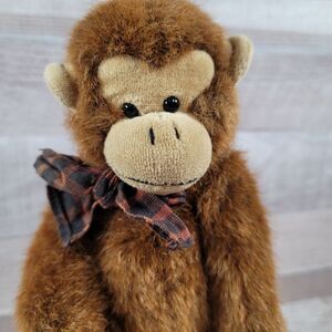 The Boyds Collection Ltd monkey plush with buffalo plaid ribbon around the neck measures approximately 11" tall and is in good gently loved condition. Does not have original name hang tag but tush tag is attached. Stand is for photographing purposes only - NOT included.