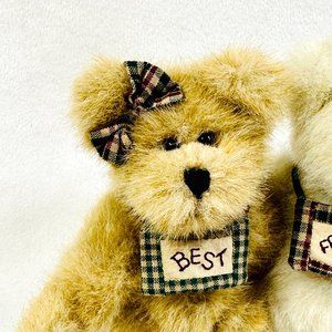 Boyds Collection "Best Friends" bears. These two bears are attched, and each one is wearing a necklace that together read "Best Friends." Both bears have movable arms and legs. They can't really stand on their own, but they sit fine. The heads can turn a little to each side as well. The cords that the necklaces are on have loops on the back, so they may possibly be hung as a wall decoration. Each bear has a tush tag. Both bears are in great overall condition. No stains or flaws. Each one has a bow in her hair. Vintage bear. Date on tag is 1998-2000.