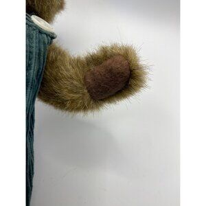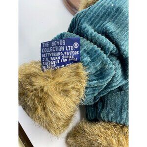 This charming Boyd’s vintage teddy bear features soft fur and corduroy overalls, mounted on a wooden stand for display. A timeless collectible.