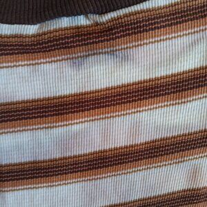 This charming vintage t-shirt is an ode to bygone days. Its ribbed knit fabric and classic brown-and-tan stripes evoke a nostalgic vibe, perfect for adding a retro touch to any wardrobe. A comfortable and timeless piece, it marries style with the simplicity of mid-century casual wear.