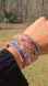 Handembroidered vintage bracelet with satin fabric and beads on denim fabric, unique design.
