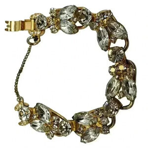 Vintage D&E JULIANA Clear rhinestone Link Bracelet. All stones are clear and bright. Set to look like flowers. Each cluster has a small stem curl. Safety chain intact. Clasp works. some gold wear on the bottom side. Possibly gold electroplated or just gold toned? see photos for condition and size. A statement piece from Juliana, hard to find