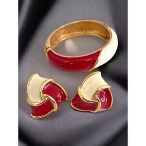 This stunning bracelet and earring set features red and cream colored enamel in a gold tone setting.