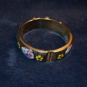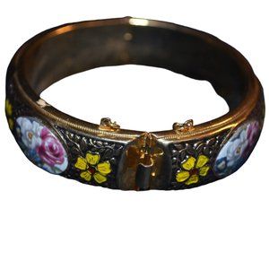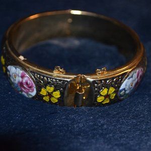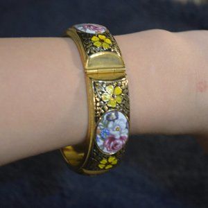 Vintage Bracelet Fine Metal Work Art Painting Floral Enamel Golden Fastener