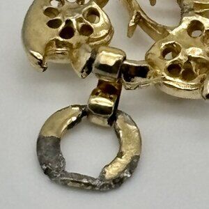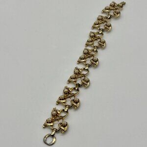 This is a very pretty vintage bracelet made of gold tone metal that depicts vines and leaves in a delicate and graceful pattern. The leaves are set with 4mm faux pearls in a pretty ivory color and are linked together with gold tone links. The bracelet closes with a foldover clasp and measures 7 inches long by 5/8 inch wide. This bracelet is in fair condition; several faux pearls have lost their finish, and the metal around the clasp is very scratched. Still beautiful on the wrist, though. Unsigned.