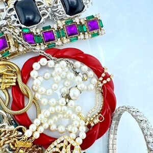 Lots of 18 retro vintage bracelets! All different styles. Rhinestone, bangle, metal, plastic, stretch, faux pearl, charm, retro, gold and silver tone. Show light surface wear such as scuffs or tarnish consistent with age & normal use. Some signed.