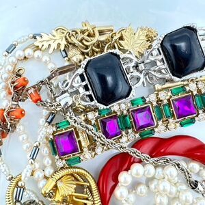 Lots of 18 retro vintage bracelets! All different styles. Rhinestone, bangle, metal, plastic, stretch, faux pearl, charm, retro, gold and silver tone. Show light surface wear such as scuffs or tarnish consistent with age & normal use. Some signed.