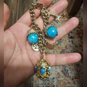 Vintage Bracelet Lucite And Confetti Glitter Glass Chunky Teal Blue Charm 1960s