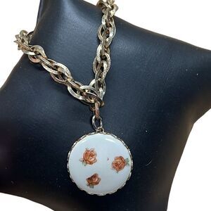 Vintage Bracelet & Pendant Matching Set Roses Floral Enamel Gold Base Metal