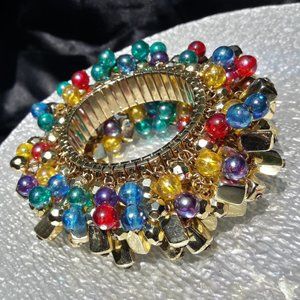 Vintage Bracelets Chunky Beaded Bracelet Vintage Jewelry Beaded Gold Beading. Good condition. Sparkling Gold beads intertwined with colorful beading red, teal, greens and blues Beads are acrylic on an expandable watch band style back. Measurements to follow but this is big and Fun!