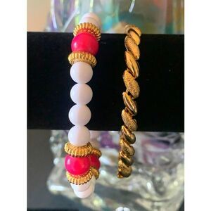 White and Red wooden beads enhanced by Gold metal circles create a Christmas bracelet