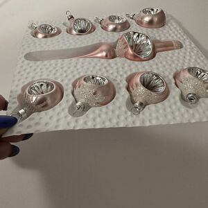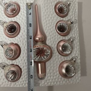 Beautiful Bradford pink glass indent ornaments & tree topper set. Lovely pink with white glitter top & silver indent center. Look like mercury glass Hand decorated, very delicate & fragile. These ornaments are small, perfect for a 2-4 foot tree.