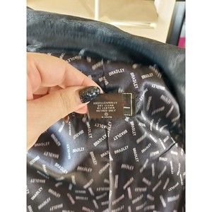 Vintage Bradley Bayou Jacket Womens M Soft Suede Leather Long Lines Chic Classy Elevate your style with this vintage Bradley Bayou women's jacket. Made from soft suede leather with a classic mid-length trench coat design, this jacket is perfect for any occasion, from casual to formal. The black color and solid pattern are timeless, while the logo accents and belted details add a touch of sophistication.