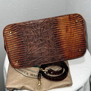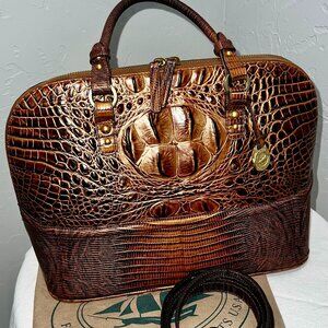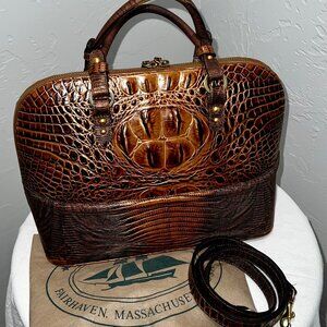 Vintage Brahmin satchel, Pecan Melbourne/Lizard bag with suede lining. Flawless condition. Comes with shoulder strap and dust bag. 9.5" tall, 12.25" wide, 7" deep. Non-smoking home. This is one of the original Brahmin styles with the rigid leather that does not collapse. It's stunning in person, with no scratches or scuffs and lining is in perfect condition.