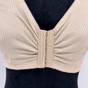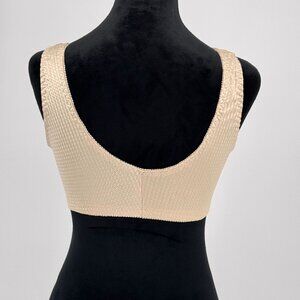 This beige bra by Dream Products is designed to provide utmost comfort while offering support. It features a front hook closure for ease of wear. Made from a blend of nylon and spandex, this bra fits snugly and adjusts to the body's natural shape, ensuring a comfortable fit throughout the day.