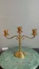 Vintage candelabra and snuffer, in very good condition - light tarnish and signs of wear on both pieces (see photos). 3 arm candelabra, brass color, felted bottom, made in china. Brass candle snuffer, wood handle, hanging hook on tip. See photos for measurements.