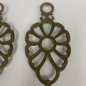 This Vintage Brass 3 Footed Leaf Design Trivets set of 2 features a leaf pattern in an abstract shape, perfect for all occasions. The trivets have a small size of 7.5 inches in length and are made of polished brass with a gold color.