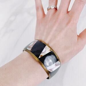 A bold mid-century piece with striking contrast, this wide bangle pairs warm brass with glossy black resin and luminous mother-of-pearl shell—capturing the geometric elegance and statement-making charm of 1960s modernist design.
