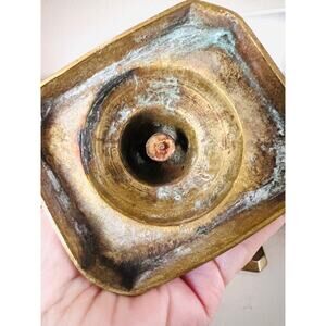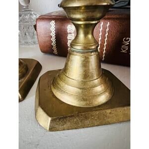 Pair of vintage solid brass candlesticks with classic baluster stems and hexagonal stepped bases—mid-century Colonial Revival style. Each stands about 7.75–8” tall and fits a standard taper. Natural patina, scattered surface marks, and spots of verdigris from age/use. One candlestick is missing the internal screw, so it’s a bit loose; still displayable and stands upright. The other tightens normally. Sold as found; you can replace the screw at a hardware store or use museum wax if you prefer a quick fix.