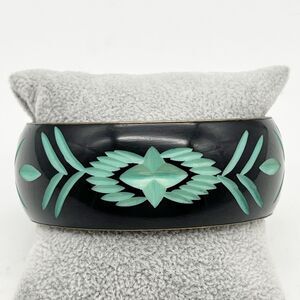 Vintage Brass Carved Enamel Chunky Bangle Bracelet Black Turquoise Green Size 8