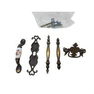 This collection of vintage drawer pulls exudes timeless elegance and sophistication, ideal for restoring or enhancing antique furniture. The intricate brass designs paired with a floral ceramic pull add a distinctive touch, while the sturdy construction ensures durability. Complete with all necessary mounting hardware, these pulls bring a classic charm to any piece.