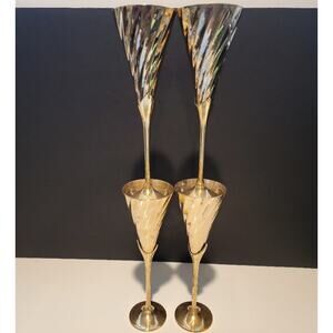 Elevate your special occasions with this set of 4 vintage brass champagne flutes! Their timeless, classic charm and tapered swirl design make them perfect for any celebration.