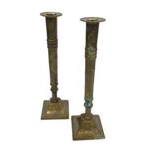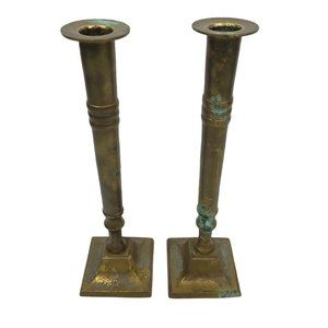 Pre-owned condition. Both candlesticks show a nice patina. Approximate size: 9.75" T. Please see all photos for further description and condition.