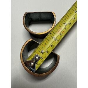 Each napkin ring measures approximately 2.5 inches across and 1.75 inches in height (see tape measure photos for scale). Shape is rounded on the outside, flat on the back.