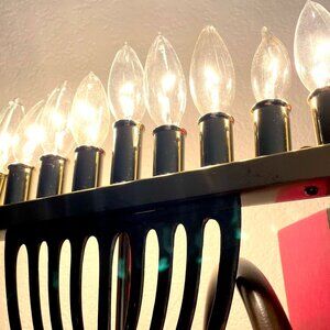 Minor surface wear on brass finish, and some light scratches on the metal top. A couple of the lights wiggle a little but work great. Can be lightly unscrewed to turn lights out as the holiday progresses. Such a beautiful statement piece!