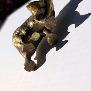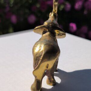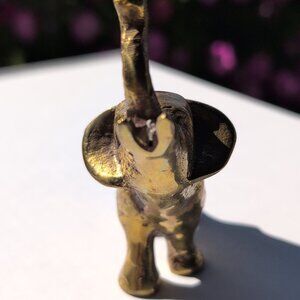 This adorable brass elephant is approximately 3 and 3/4 in long by 4 in tall at the tip of his trunk. This elephant has his trunk up. Bringing good luck. Was made in Korea and is a vintage brass piece.