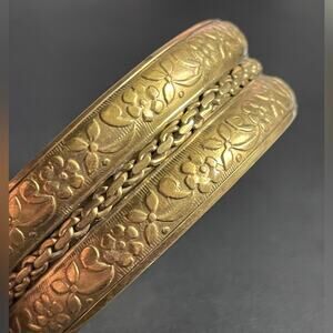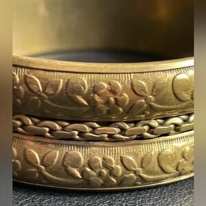 Vintage Brass Embossed Floral & Chain Bangle Bracelet