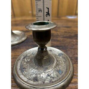 This set of vintage brass candle holders features intricate etched designs, offering a classic touch to any decor.